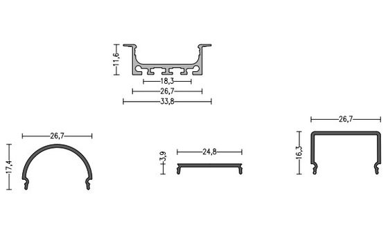 Carcaça de Lâmpada LED de 33,8 mm (L) para Fita LED em Alumínio Anodizado com 3 Tipos de Cobertura e Perfil LED de Alumínio Embutido
